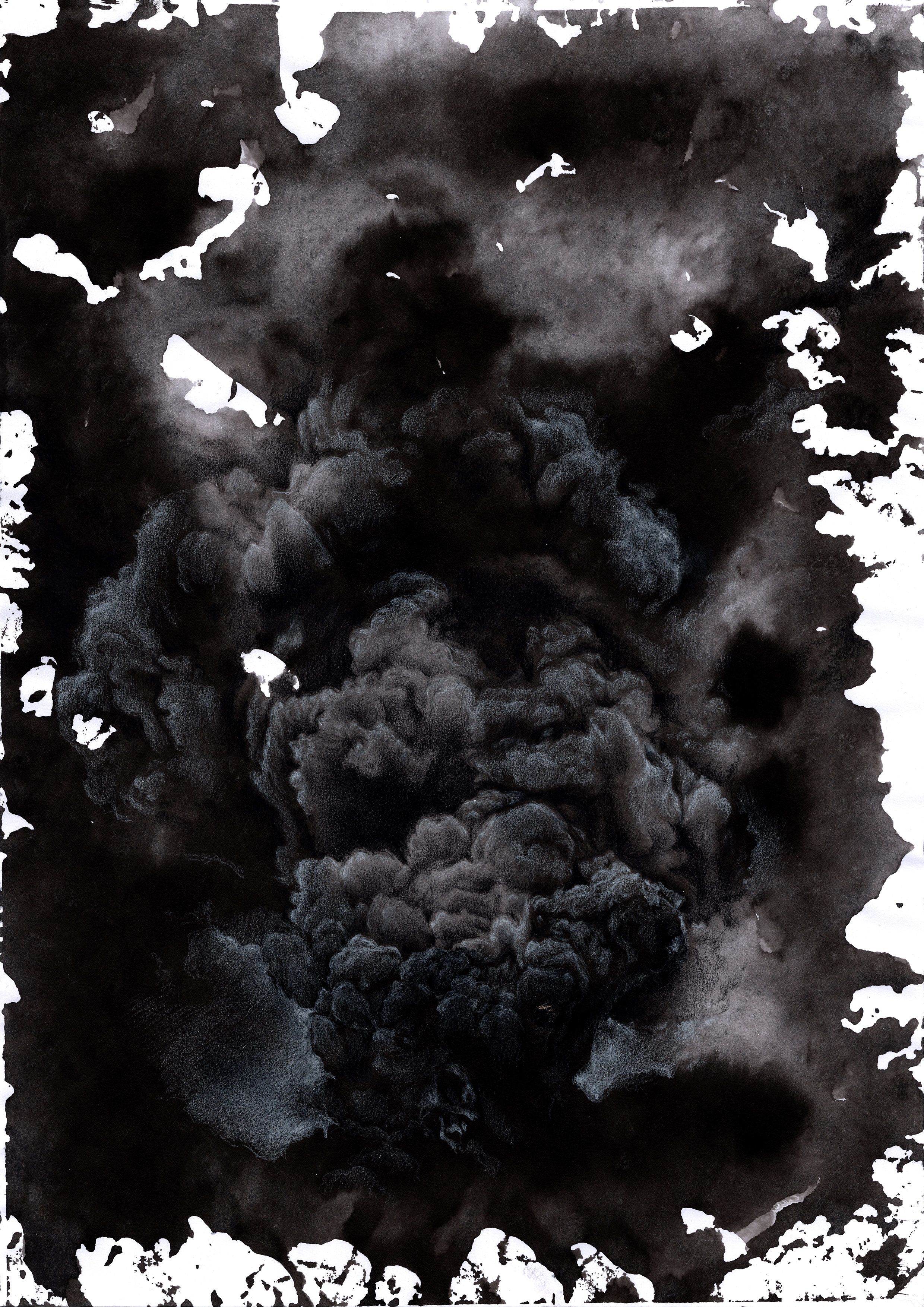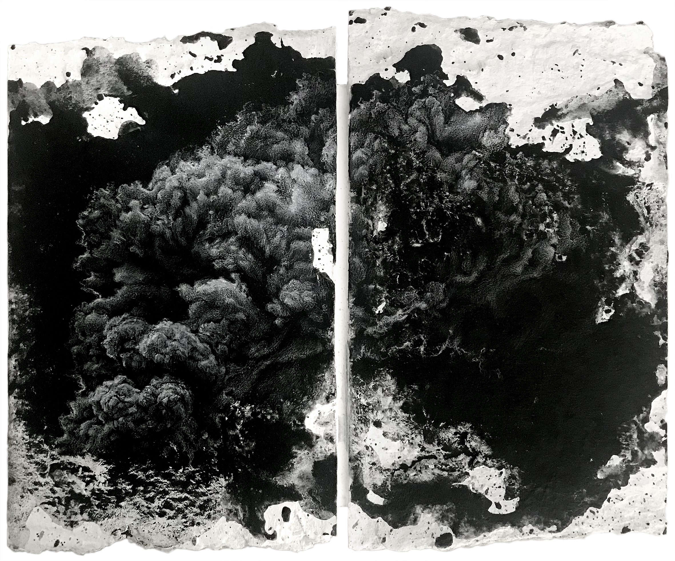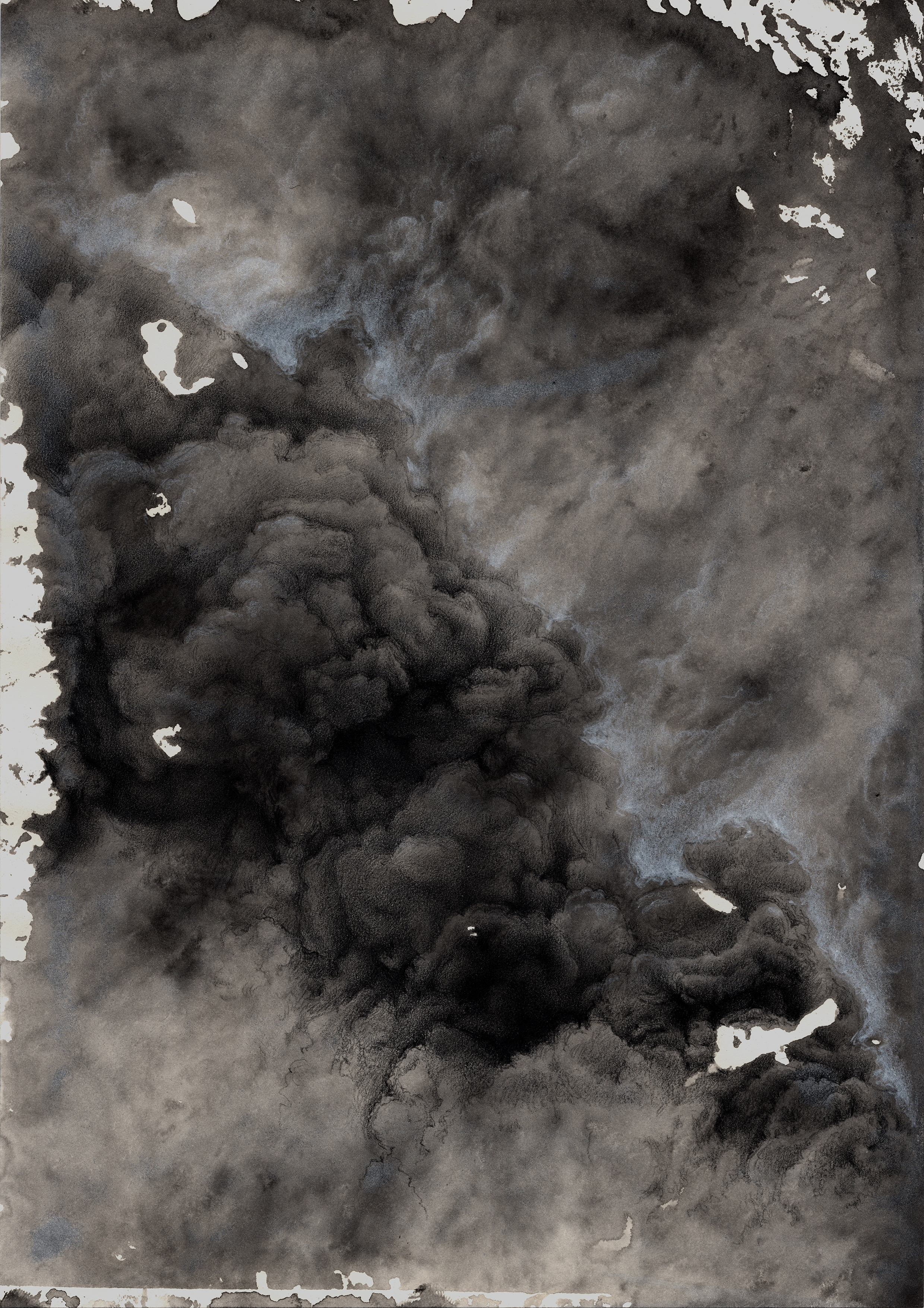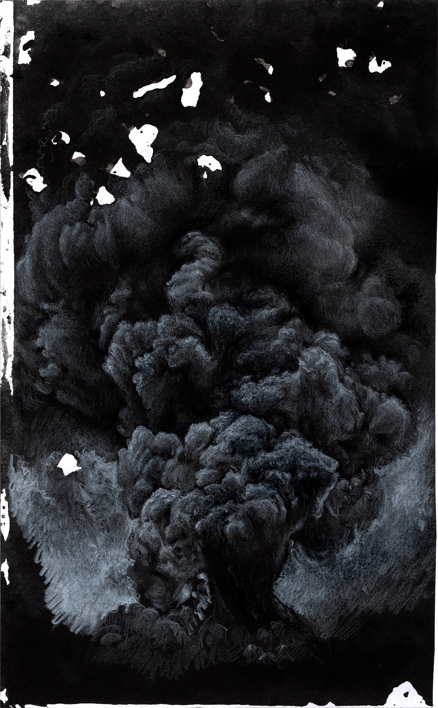 Série Smother (10 à 16), 2024. Crayon noir et blanc sur monotype acrylique noir, sur carton 1 700 grs, avec des effets de textures et des déchirures.
