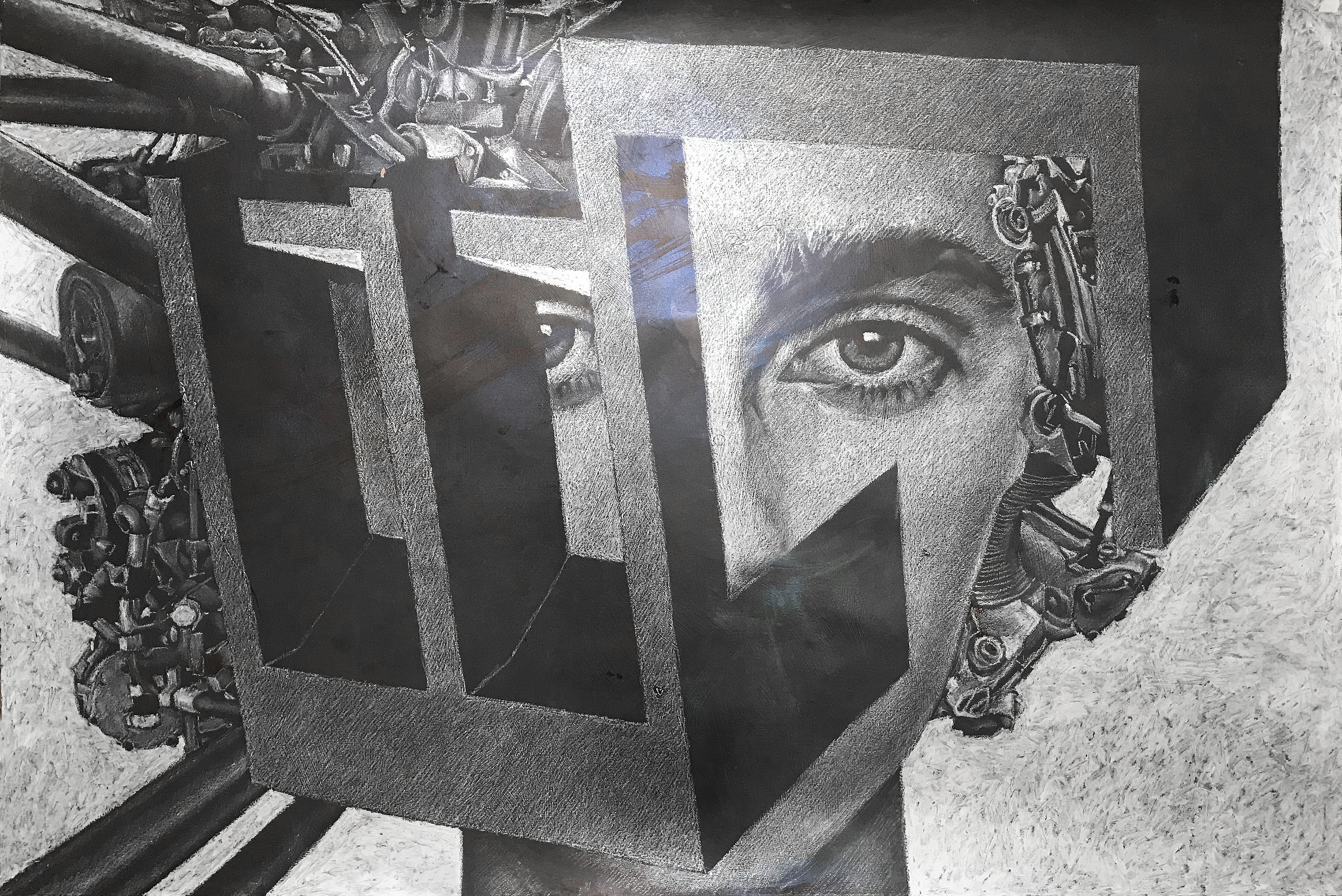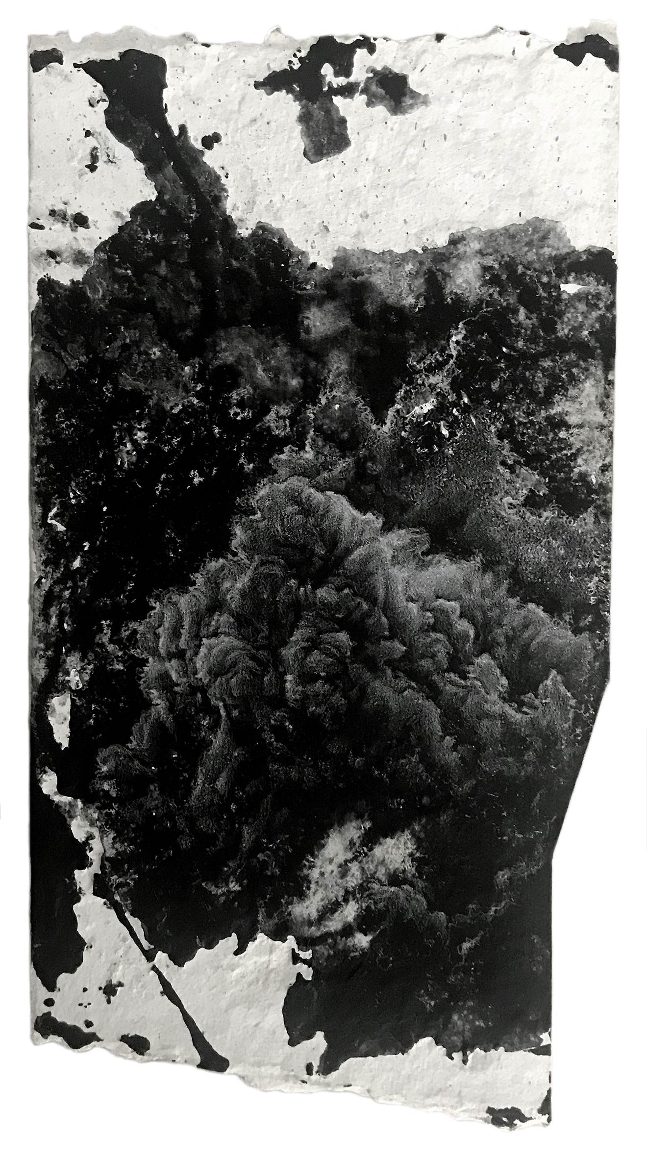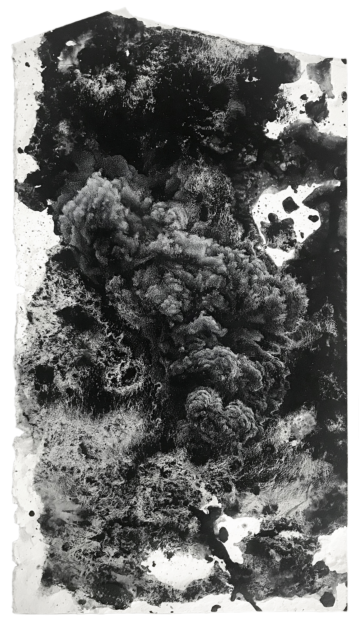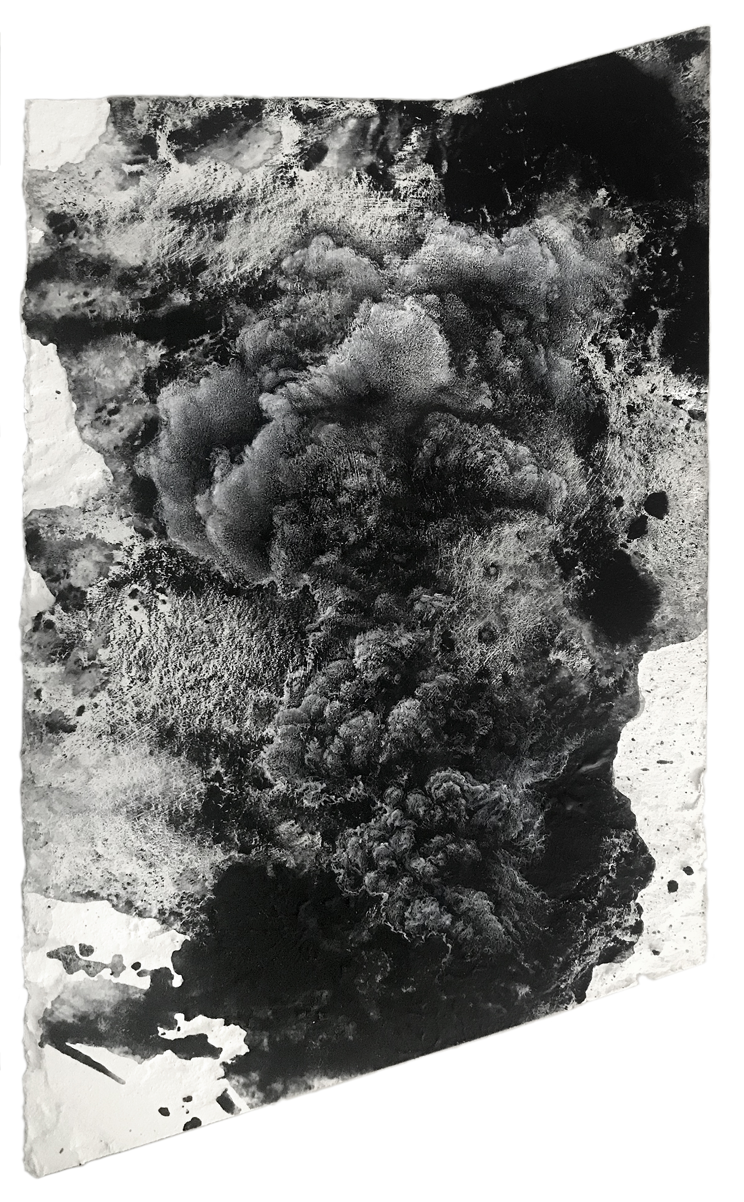 Série Smother (10 à 16), 2024. Crayon noir et blanc sur monotype acrylique noir, sur carton 1 700 grs, avec des effets de textures et des déchirures.