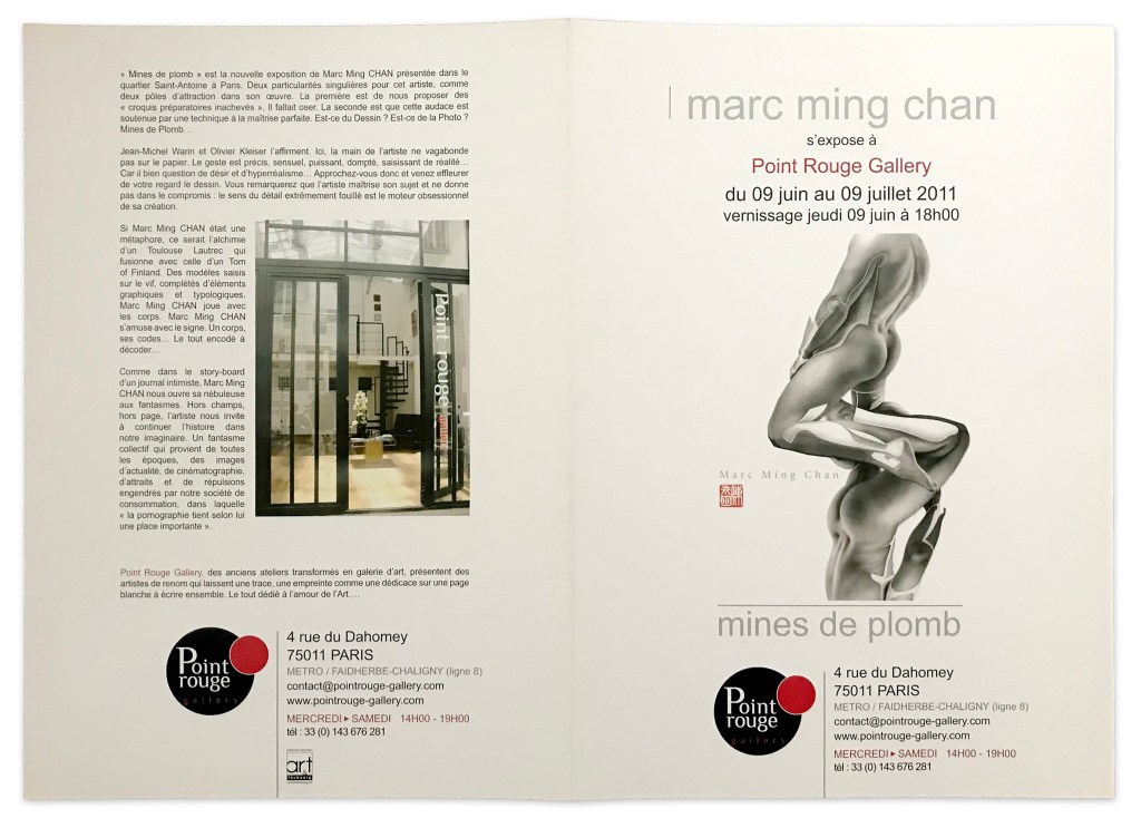 Il en est souvent de même dans le travail de Marc Ming Chan, travail qui a pris tour à tour la forme de livres, d’affiches, de cartes postales, d’illustrations pour magazines, d’œuvres exposées dans des bars, des magasins ou des galeries d’arts françaises, américaines ou hollandaises. Mais de ces lieux et de ces objets de circulations multiples et différenciées s’il en fallait, nous n’en avons pas encore dévoilés la teneur. En effet, il s’agit le plus souvent de dessins au crayon noir, de facture classique, parfois accompagnés de mots ou de textes, dont le sujet central pourrait se définir ainsi : les pratiques sexuelles des homosexuels aujourd’hui. Peu importe, comme dans un livre, comme dans une photographie, si tout cela est une réalité ou une fiction, un reportage ou une mise en scène, un tissu d’expériences accumulées ou une interprétation, tout cela parle et fait image, tout cela nous parle et se révèle à nos yeux non comme une vérité mais comme un dicible, un possible, un en-visageable. En quoi est-ce important dans un monde que l’on dit si permissif et que par trop traversé d’images sexualisées à l’extrême ? Justement par que ces dernières images ne re-présentent rien et ne nous re-présentent en rien, Elles ne sont que des couches ou des effets de surfaces lisses, propres et policées. Elles ne prennent ni la parole, ni ne donnent de visage à l’autre, ni ne re-donnent quelque chose au visible. Rien de la vie ou du monde n’y circule. En revanche, fondé sur cette technique particulière du dessin qui point par point, trait par trait, tire la figure du néant du blanc de la feuille de papier pour que le sujet accède à une re-présentation – néant où elle pourrait, presque à tout moment, retourner –, le travail de Marc Ming Chan d’une part, et ce n’est pas la moins importante, livre de l’homosexualité une réalité vivante, active, sexuée qui, il n’y a pas si longtemps que ça, était encore clandestine. Et, dès lors, la délivre de ses “voiles”, de ses “gardes”, de ses “fantômes” – sinon de ses “secrets” –, en lui donnant une parole, un visage, explicite et sans compromis. Mais il y fait surtout circuler du souffle, du sang, des cris, des larmes, de la salive, de la sueur et du sperme ; autrement dit, les aspérités du corps, du désir, du plaisir y font prises, les fluides s’y déversent, la jouissance ou la souffrance y font saillies.