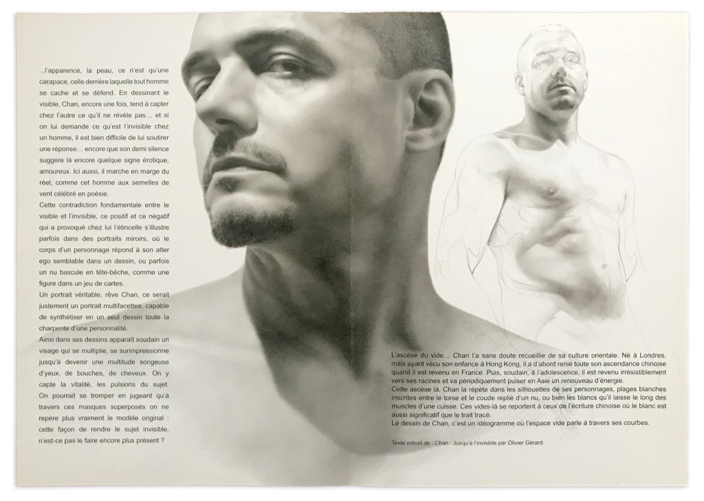 Tandis que dans la réalité, par le trait, la touche, la courbe ou l’estompe son regard aigu, ses mains éloquentes envahissent un papier que la blancheur défend, Chan, au fond de lui-même, tel le piéton de l’espace progressant d’une marche impalpable dans le cosmos, avance à pas mesurés dans son exploration de l’invisible. C’est bien ce qu’il cherche, Chan : plus il dessine, plus son crayon s’active, plus les formes naissent sur sa page, et plus il progresse dans sa quête de ce qui est au delà de l’image – sa quête pour traquer le vide. Pas le vide du néant, ni celui qui refuse la vie : un vide qui enjambe les apparences, se met à parler quand le graphisme se tait, un vide puissant et riche impossible, suggère-t-il, à traduire autrement que par la blancheur.