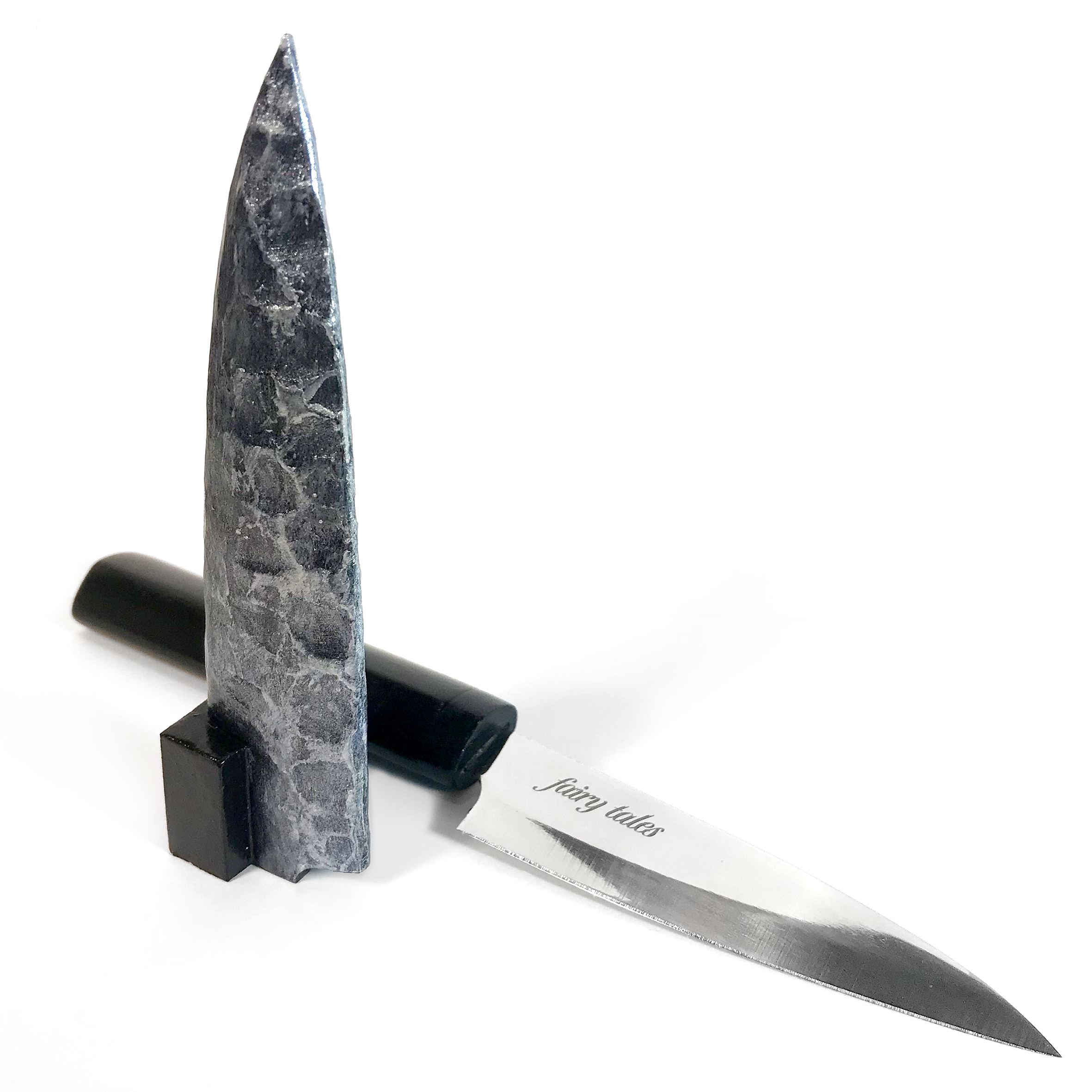 Comme tous les couteaux des 5 artistes de Fairy Tales, sa lame d’acier, de fabrication japonaise, est gravée du titre de l’exposition.