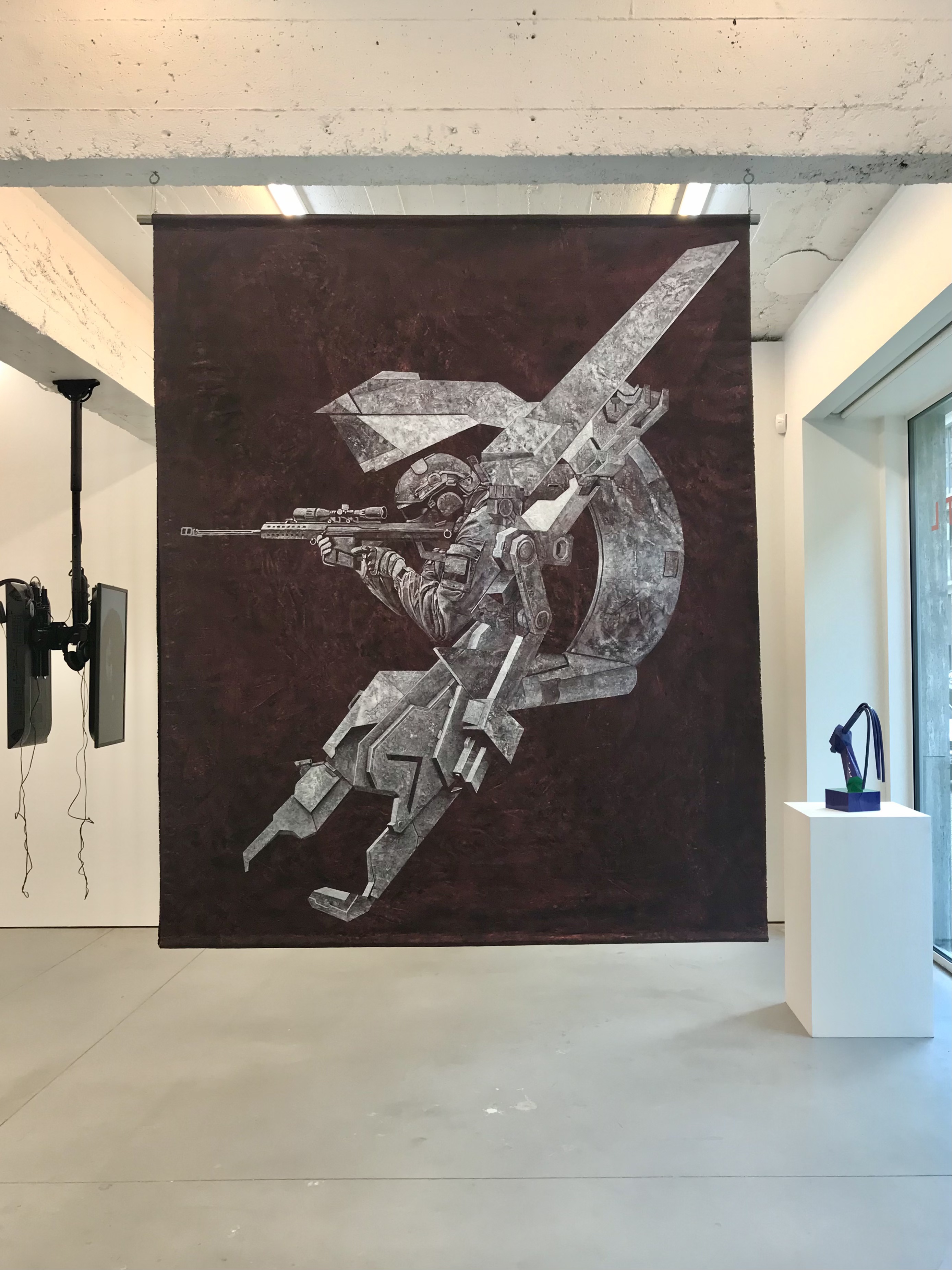 Les structures mécaniques autour des deux personnages fonctionnent comme des boucliers. Ils sont élaborés à partir d’éléments de tanks, de réacteurs ou de fuselages aéronautiques. Leur représentation dure et solide – quoique chaotique et déstructurée – résonne ici comme une construction subconsciente. Imparfaite et transitoire, l’illusion ne fonctionnera que jusqu’à la prochaine mise à jour.