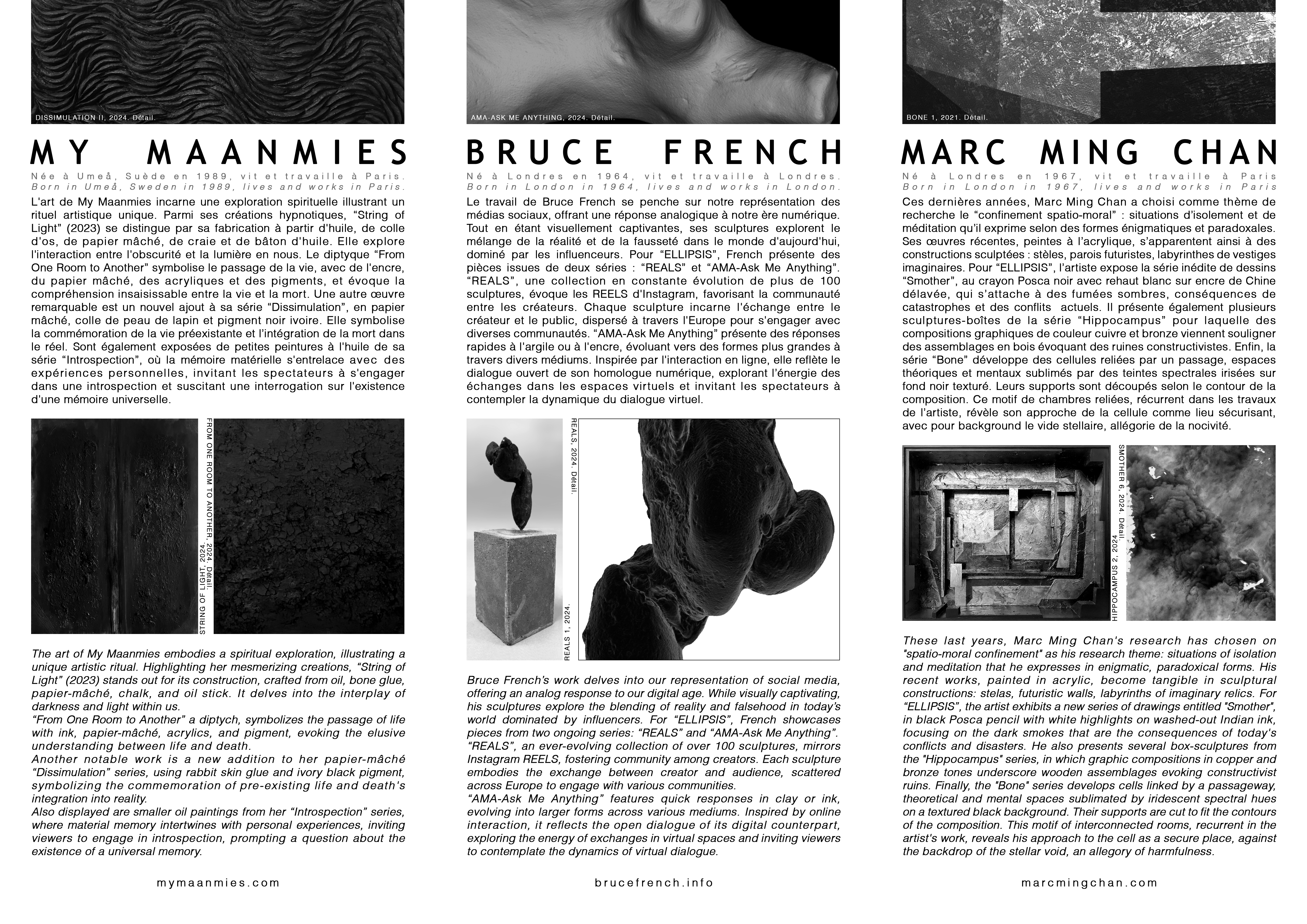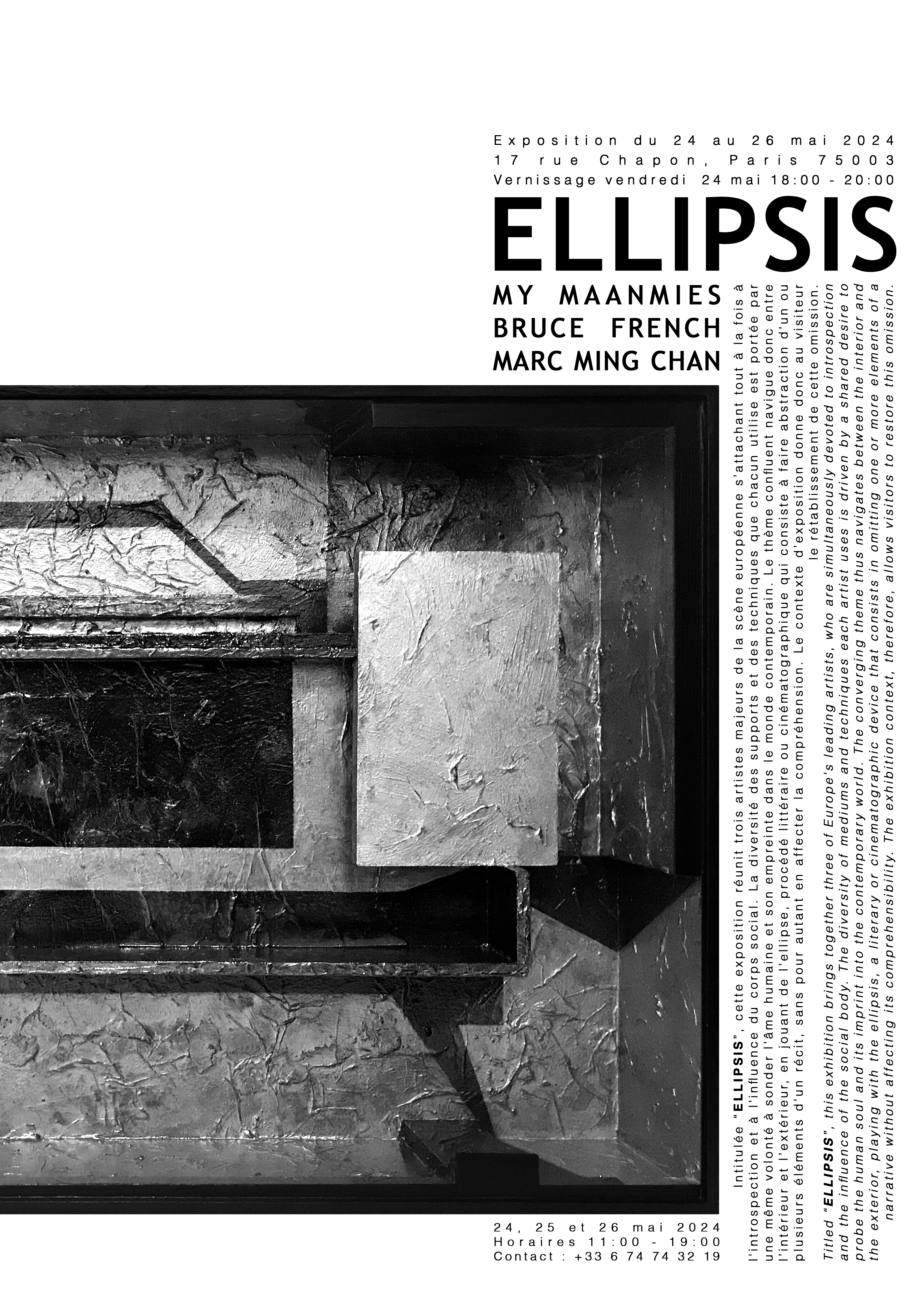 Intitulée “ELLIPSIS”, cette exposition réunit trois artistes majeurs de la scène européenne s’attachant tout à la fois à l’introspection et à l’influence du corps social. La diversité des supports et des techniques que chacun utilise est portée par une même volonté à sonder l’âme humaine et son empreinte dans le monde contemporain. Le thème confluent navigue donc entre l’intérieur et l’extérieur, en jouant de l’ellipse, procédé littéraire ou cinématographique qui consiste à faire abstraction d’un ou plusieurs éléments d’un récit, sans pour autant en affecter la compréhension. Le contexte d’exposition donne donc au visiteur le rétablissement de cette omission.