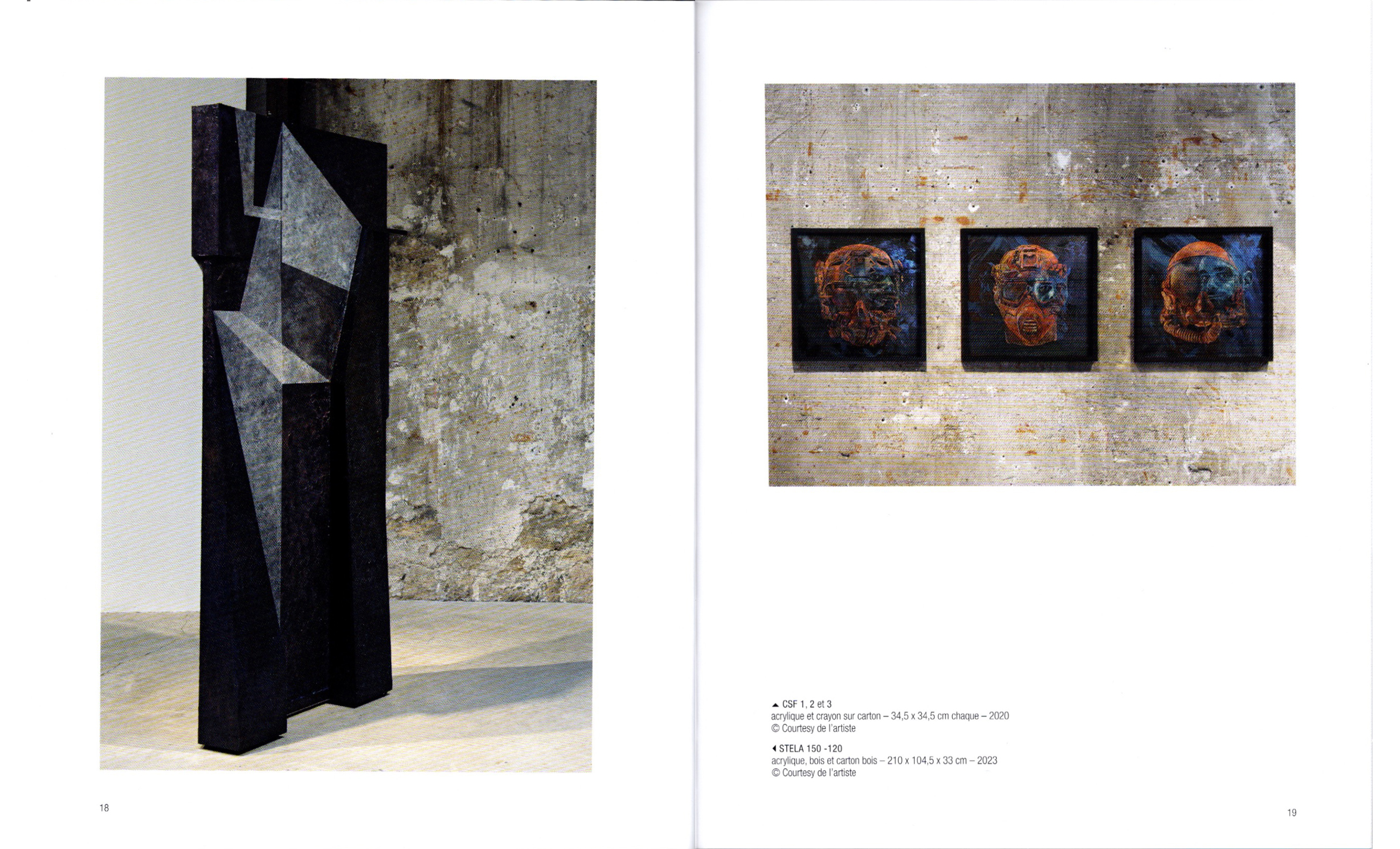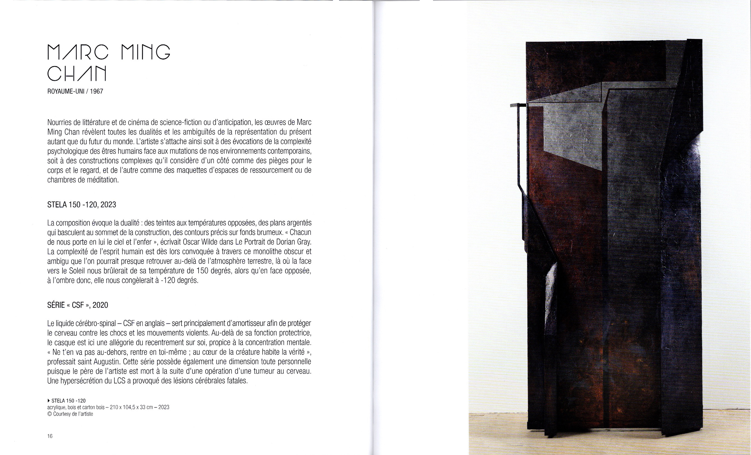 Ces dernières années, Marc Ming Chan a choisi comme thème de recherche le “confinement spatio-moral” : situations d’isolement et de méditation qu’il exprime selon des formes énigmatiques et paradoxales. Ses œuvres récentes, peintes à l’acrylique, s’apparentent ainsi à des constructions sculptées : stèles, parois futuristes, labyrinthes de vestiges imaginaires. Pour “ELLIPSIS”, l’artiste expose la série inédite de dessins “Smother”, au crayon Posca noir avec rehaut blanc sur encre de Chine délavée, qui s’attache à des fumées sombres, conséquences de catastrophes et des conflits actuels. Il présente également plusieurs sculptures-boîtes de la série “Hippocampus” pour laquelle des compositions graphiques de couleur cuivre et bronze viennent souligner des assemblages en bois évoquant des ruines constructivistes. Enfin, la série “Bone” développe des cellules reliées par un passage, espaces théoriques et mentaux sublimés par des teintes spectrales irisées sur fond noir texturé. Leurs supports sont découpés selon le contour de la composition. Ce motif de chambres reliées, récurrent dans les travaux de l’artiste, révèle son approche de la cellule comme lieu sécurisant, avec pour background le vide stellaire, allégorie de la nocivité.