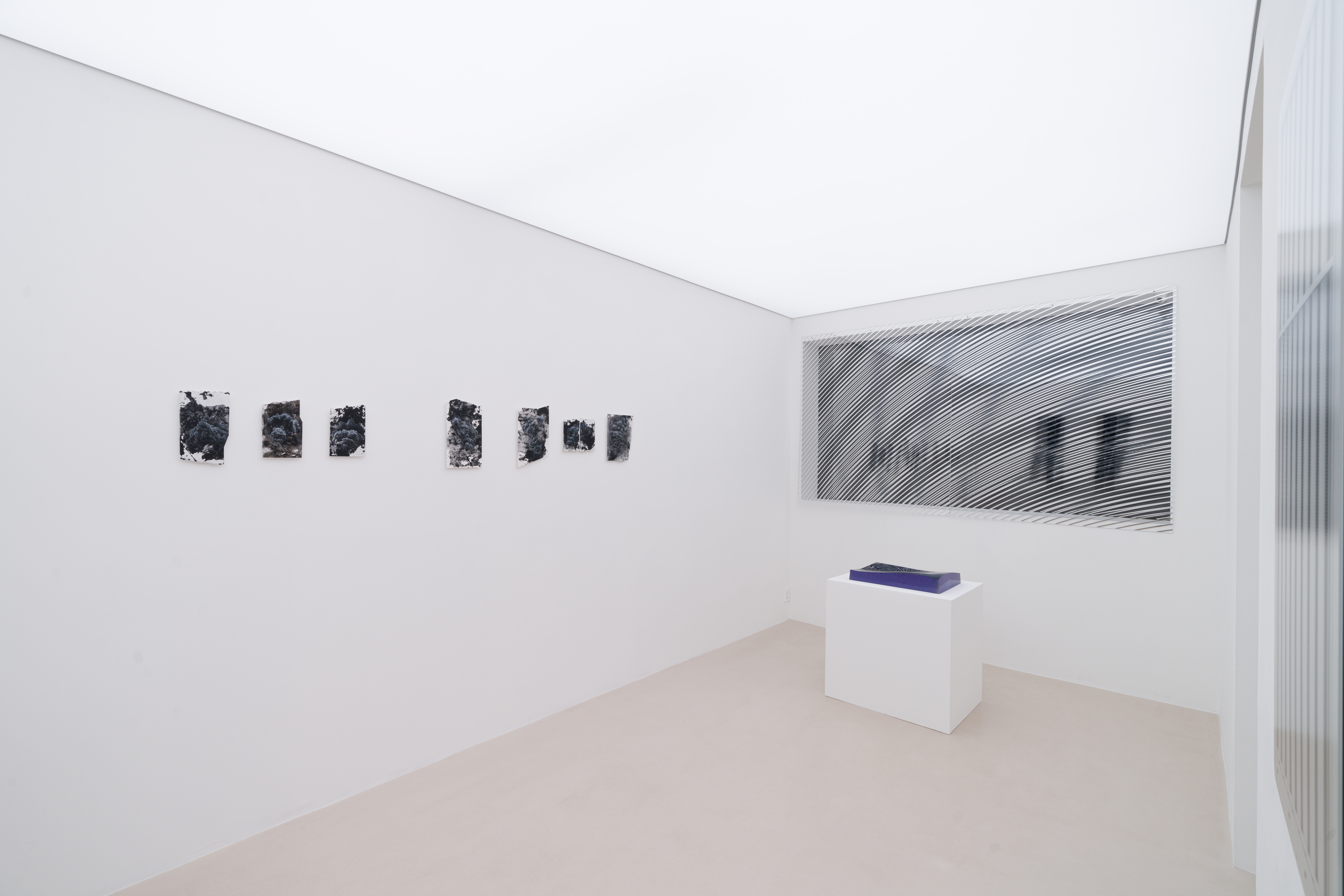 As you walk towards the exhibition space, the first work you encounter from the outside of the building is Carla Arocha & Stéphane Schraenen’s Twilight Zone, a piece that materializes the fantastical aspect of fairy tales through architectural intervention. The duo, who have been collaborating since their 2004 project at Kunsthalle Bern, continuously reinterpret the visual lexicons of 20th-century European and Latin American abstract art, minimalism, and op art. They often create installations that respond to or intervene in specific sites. At WWNN, they attached a material to the gallery’s glass windows that generates a moiré effect, transforming the exhibition space into one filled with “glittering mist, dazzling smoke, and silvery clouds.” The interference patterns on the glass surface distort the gaze and light that penetrate through the gallery from the outside, setting the exhibition as a transitional “twilight zone” as the title suggests. In this space, both the audience and the artworks experience possibilities of transformation, change, and mutation.